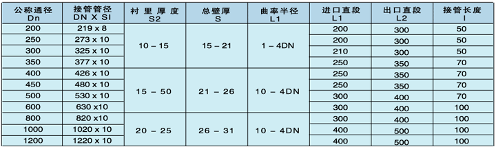 制作特殊规格的弯管时,只要提供接管管径及长度,衬里厚度,曲率半径,角度以及进出口加长直段等数据,可根据客户要求生产各种规格弯管及方圆节;